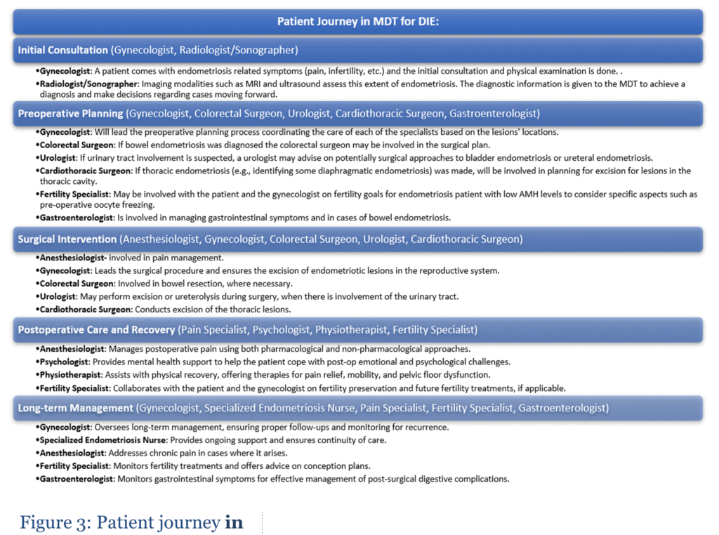 A multidisciplinary team approach is a collaborative model of healthcare that integrates professionals from diverse disciplines to provide comprehensive coordinated care for patients with complex medical conditions (3,4,7). The MDT approach has significantly gained recognition and has been implemented across various medical fields, especially in managing chronic and multifaceted diseases. The MDT approach has increasingly become significant in managing endometriosis due to the disease’s complexity and its broad impacts on the lives of patients (11). The MDT usually comprises gynaecologists, colorectal surgeons, urologists, radiologists, cardiothoracic surgeons, pain management specialists/anaesthesiologists, fertility experts, physiotherapists, specialized nurses, nutritionists, and psychologists (3,19). The core of the MDT approach involves regular team meetings focused on discussing patient cases and formulating treatment plans. The forums ensure shared decision-making where each individual contributes their expertise to develop a comprehensive approach to managing the patient’s condition. This ensures that all aspects of the patient’s care are considered from the onset, diagnostic procedures to surgical planning and long-term care in management including psychological support (3).