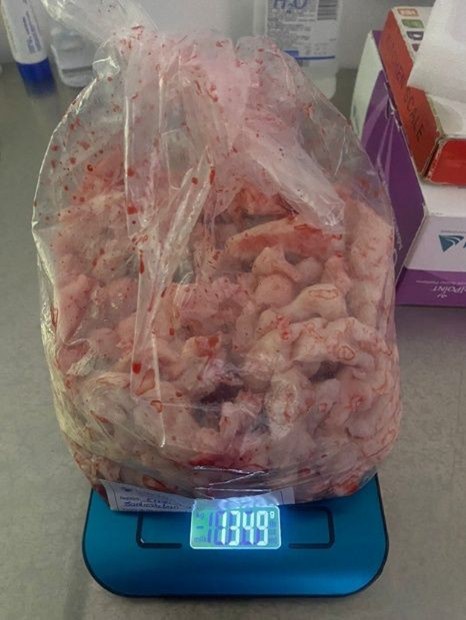 Given these findings and the persistence of symptoms, a total laparoscopic hysterectomy was performed. During the procedure, classified as highly complex, a large uterine fibroid was identified that completely occupied the left broad ligament, as well as a parasitic myoma located on the right pelvic wall. A myomectomy of the parasitic tumor was performed, followed by a total hysterectomy. The surgical specimen was removed by morcellation (Figure 2-7), weighing a total of 1,349 grams (Figure 8). The estimated intraoperative blood loss was 1,000 ml, with no additional complications.