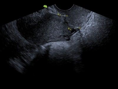 A 36-year-old female patient, G2 P1 A1, with no significant medical history. Her first pregnancy ended with a cesarean section at 27 weeks due to cervical incompetence, with a newborn weighing 850 g. She subsequently suffered an incomplete miscarriage at 19 weeks, also secondary to cervical incompetence, resolved by instrumental uterine curettage. Given the clear history of cervical incompetence, a laparoscopic transabdominal Benson-Durfee cerclage was performed. The procedure was performed without complications, the procedure lasted 60 minutes, a V Care type uterine mobilizer was used, with an estimated blood loss of 100 ml, and she was discharged the following day. Subsequently, the patient continued with follow-up and ultrasound confirmed the correct placement of the cerclage. (Figure 1).