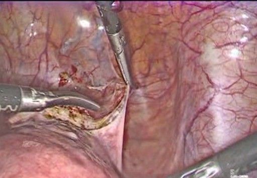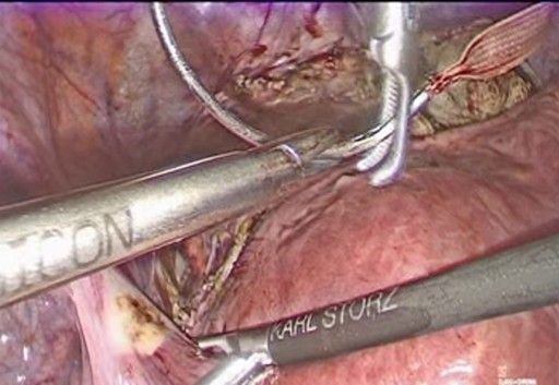 - Final review and closure (Figure 12-13): The absence of bleeding is verified along the dissection path and around uterine vessels, the vesicouterine peritoneum is repositioned over the dissected area, covering the tape knot, and trocars are removed under direct vision and the cavity is deflated.