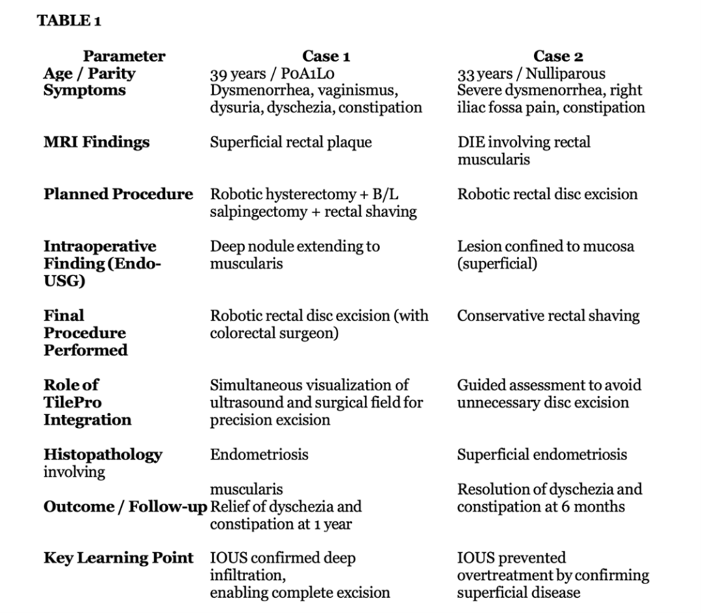 Case 1: A 39-year-old G1P0A1L0 woman presented with severe dysmenorrhea, vaginismus, dysuria, dyschezia, and constipation refractory to medical therapy. Preoperative MRI demonstrated uterine adenomyosis with a superficial rectal plaque. During robotic surgery, dense adhesions in the rectovaginal space raised suspicion of deeper rectal involvement. Intraoperative Endo-USG revealed a hypoechoic lesion extending up to the muscularis layer of the rectum. Based on these findings, a robotic rectal disc excision was performed in collaboration with a colorectal surgeon. TilePro integration allowed confirmation of complete excision and rectal wall integrity. Histopathology confirmed muscularis-involving endometriosis. At one-year follow-up, the patient reported complete resolution of bowel symptoms.