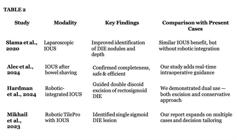 Surgical management of bowel endometriosis must be individualized according to the depth of bowel wall infiltration (3). Rectal shaving is appropriate for superficial disease, whereas disc excision or segmental resection is reserved for deeper infiltration. Accurate intraoperative assessment is therefore critical. In our experience, intraoperative Endo-USG provided real-time anatomical information that directly influenced intraoperative decision-making. In Case 1, ultrasound confirmed muscularis involvement, justifying disc excision. In Case 2, ultrasound findings contradicted preoperative MRI, allowing avoidance of unnecessary bowel resection. Previous studies have demonstrated the utility of intraoperative ultrasound in bowel endometriosis surgery (4). However, most reports describe laparoscopic ultrasound without robotic integration or post-excision assessment. The integration of Endo-USG with robotic TilePro technology could represent a significant advancement, as it enables continuous dual visualization of surgical anatomy and ultrasound findings without interrupting the surgical workflow (5). This approach may enhance surgical precision, reduces intraoperative uncertainty, and supports tailored, organ-preserving surgery. Although limited by the small sample size and short follow- up, this report demonstrates feasibility and possible clinical benefit.