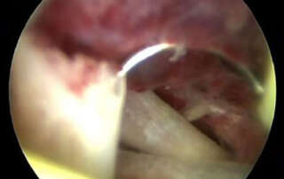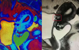 A displaced sling after pectopexy with small PP sling, detachment at the cervix (left) and sacropexy single after 4 years (right)